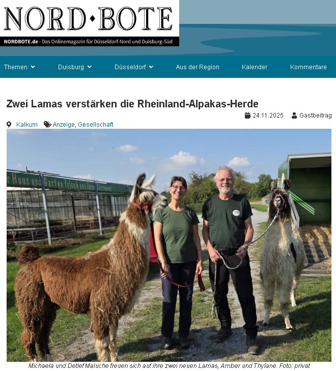 Ein weiterer Artikel über uns ist bereits im letzten Jahr erschienen: Die Rheinland-Alpakas im Düsseldorfer Norden