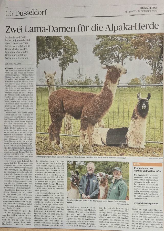 Ein weiterer Artikel über uns ist bereits im letzten Jahr erschienen: Die Rheinland-Alpakas im Düsseldorfer Norden