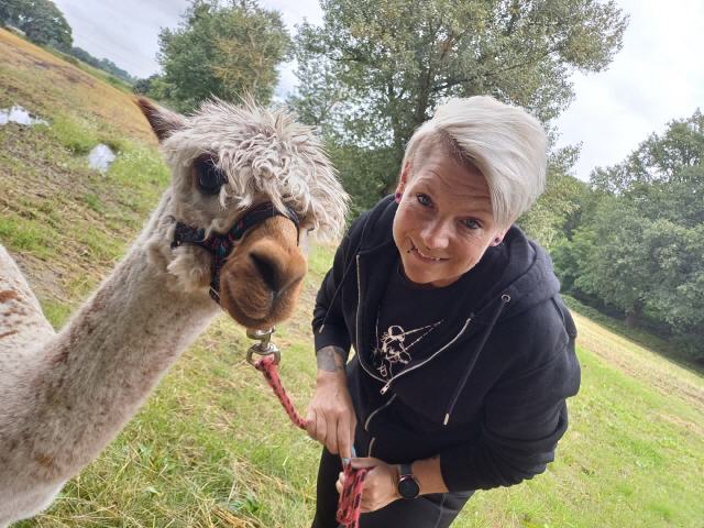 Als ich kurze Zeit später überlegt habe, was ich neben meinem Job als selbstständige Personalberaterin zusätzlich machen könnte (es sollte draußen und mit Tieren sein), fielen mir die Alpakas wieder ein, und der Kontakt zu den Rheinland-Alpakas entstand. Seitdem unterstütze ich das Rheinland-Alpakas-Team insbesondere bei der Durchführung von Teamevents. 2025 habe ich die Prüfung der Sachkunde nach §11 bestanden und betreue seitdem auch Besucher auf der Alpakaweide.