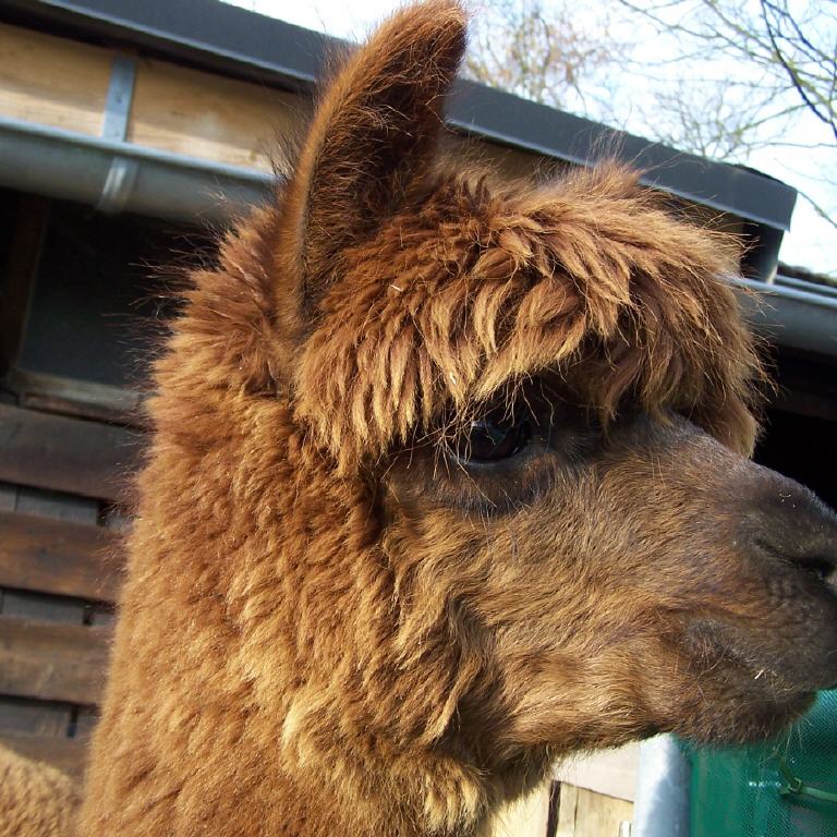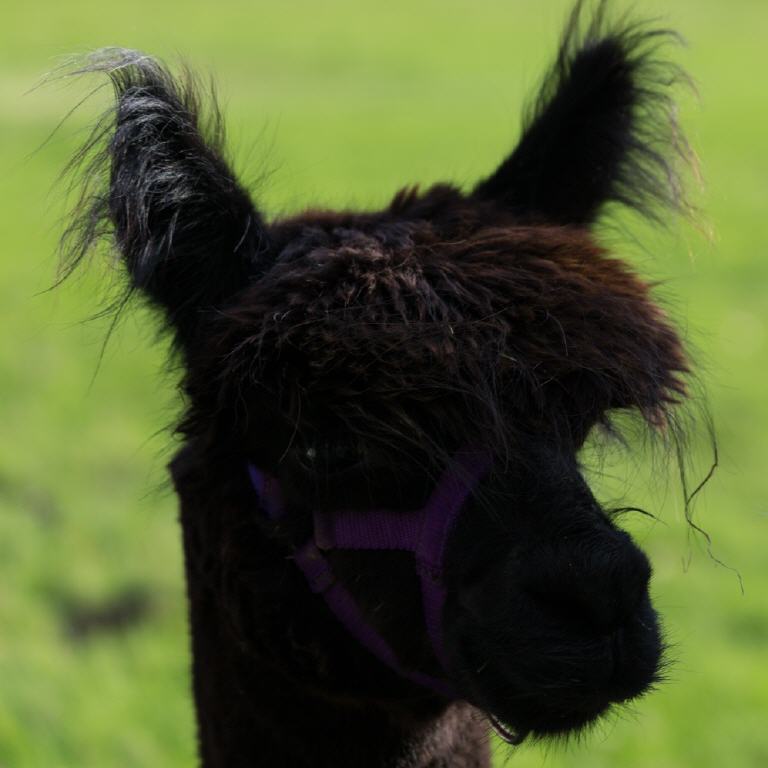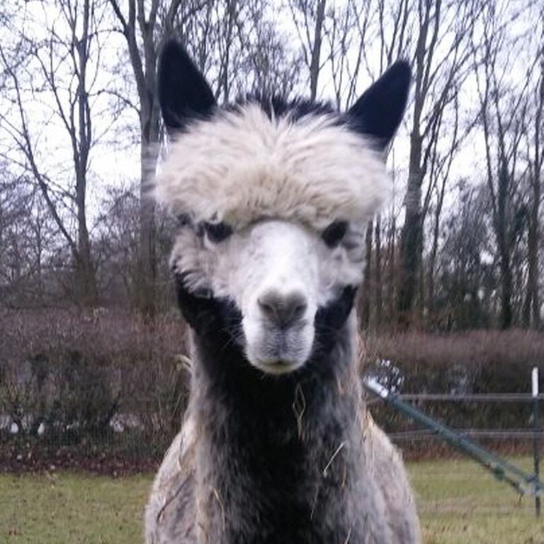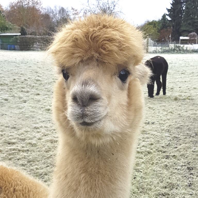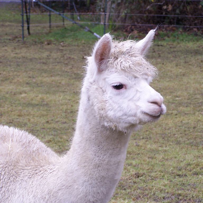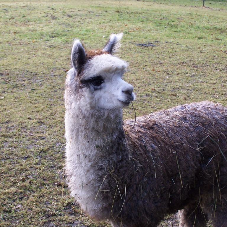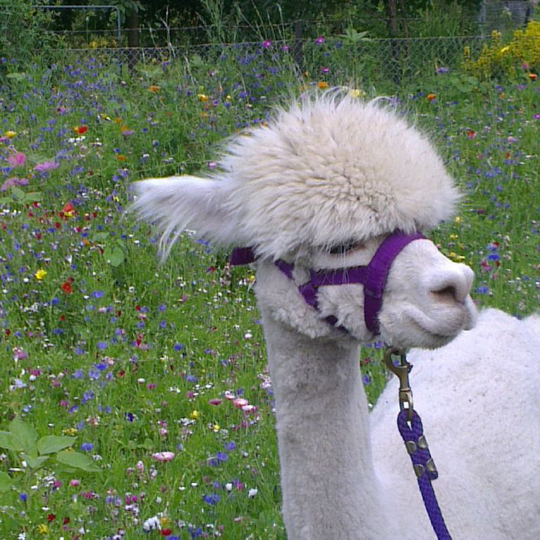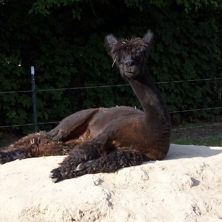 Wenn sie Lust hat, ist sie sehr zutraulich und verschmust, also ein eher untypisches Alpaka. Ansonsten frißt sie gern, hat meist ein wenig "Proviant" im Maul und bleibt bei Regen am liebsten im trockenen Unterstand. Mittlerweile hat sie im Winter eine wärmende Decke an.