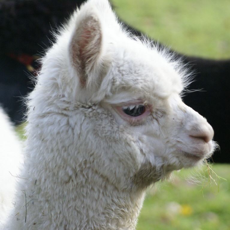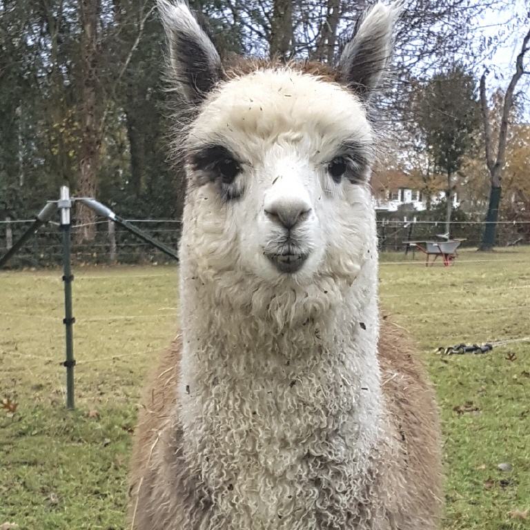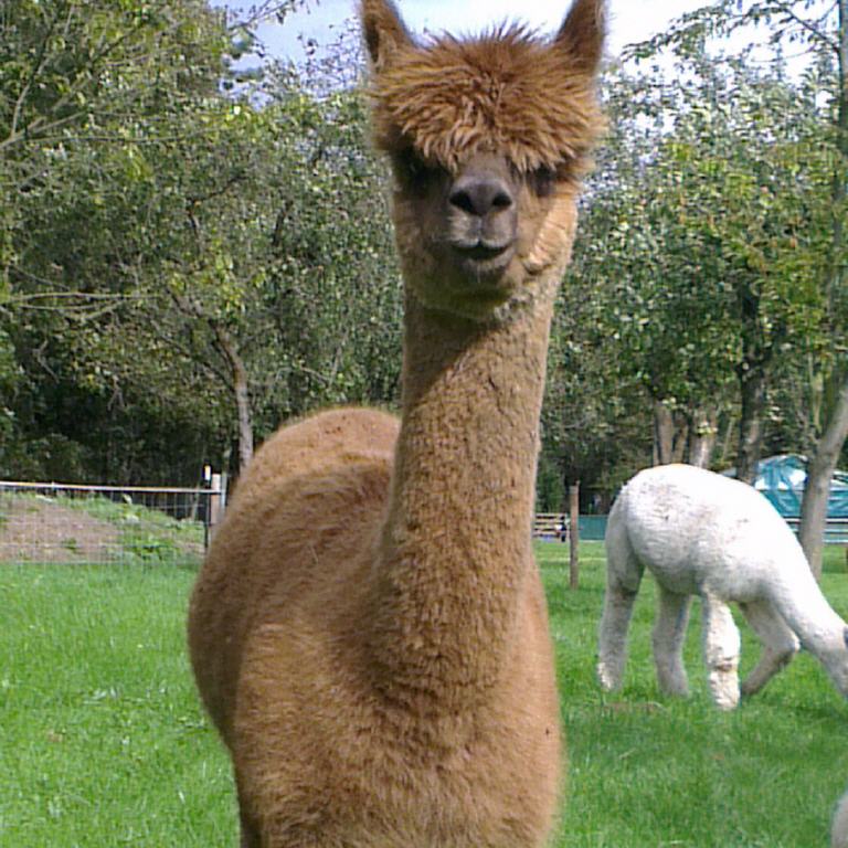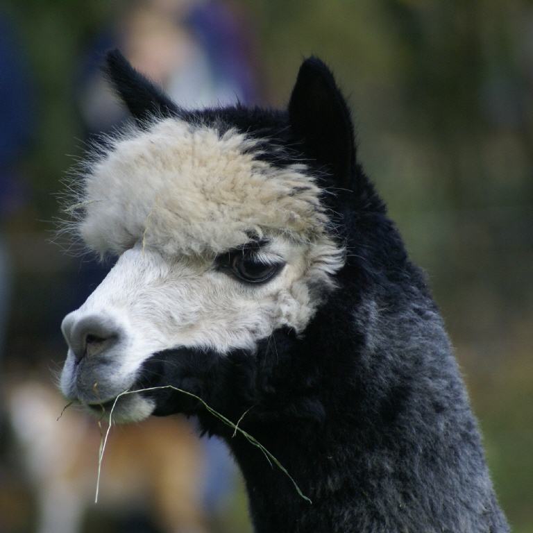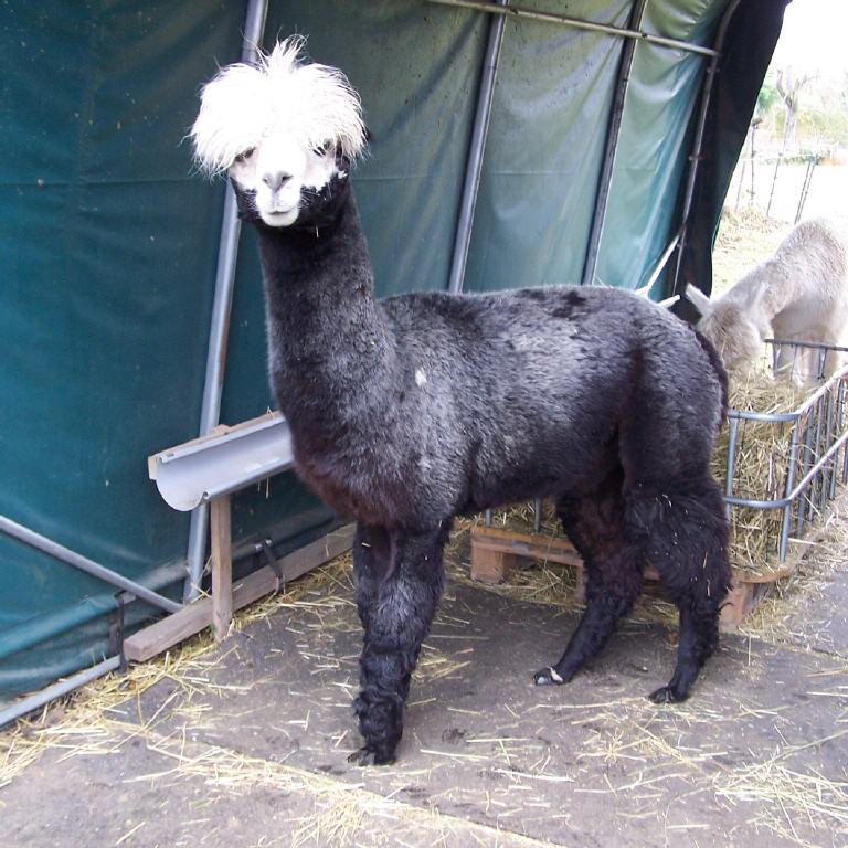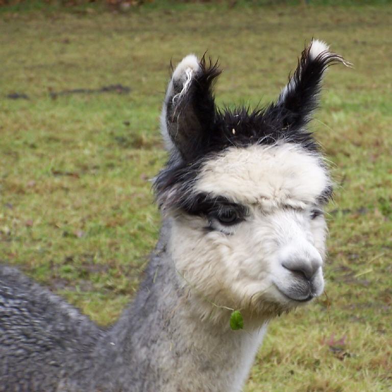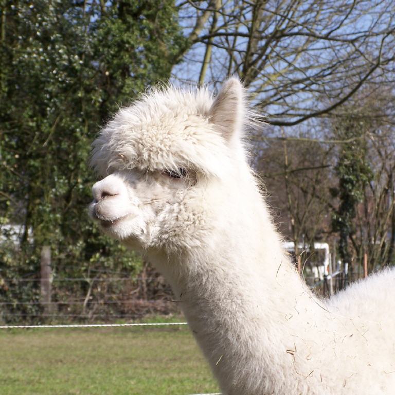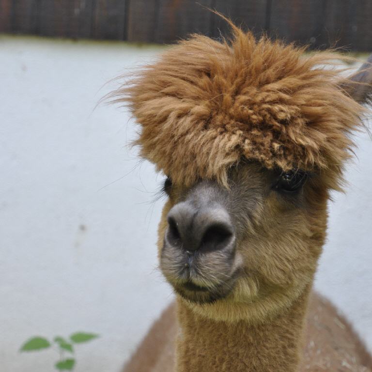 Wenn sie Lust hat, ist sie sehr zutraulich und verschmust, also ein eher untypisches Alpaka. Ansonsten frißt sie gern, hat meist ein wenig "Proviant" im Maul und bleibt bei Regen am liebsten im trockenen Unterstand. Mittlerweile hat sie im Winter eine wärmende Decke an.