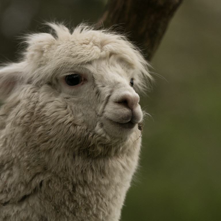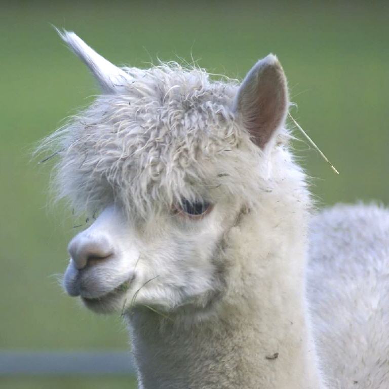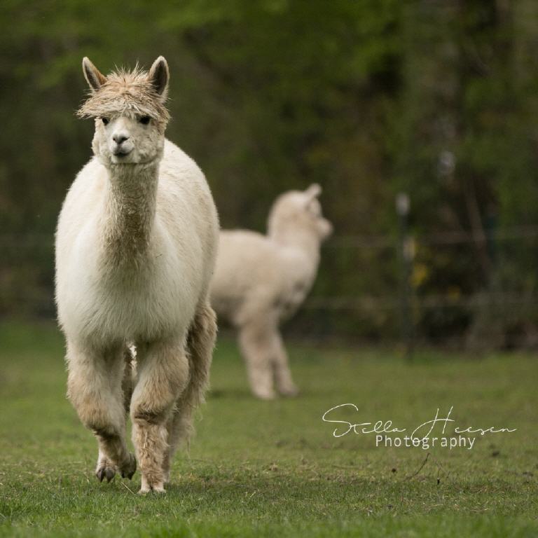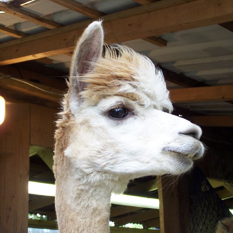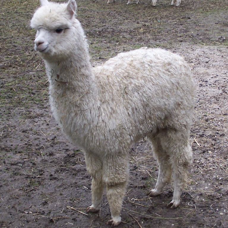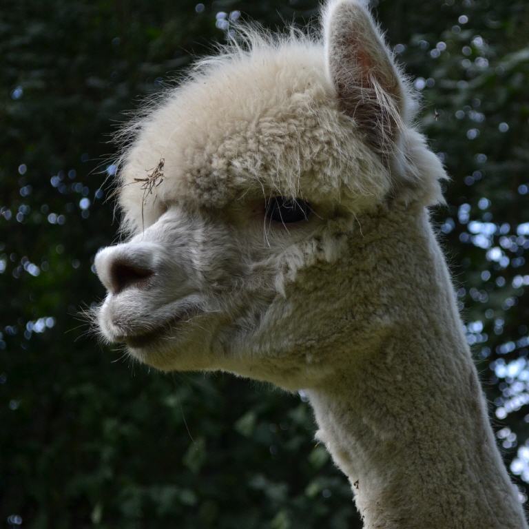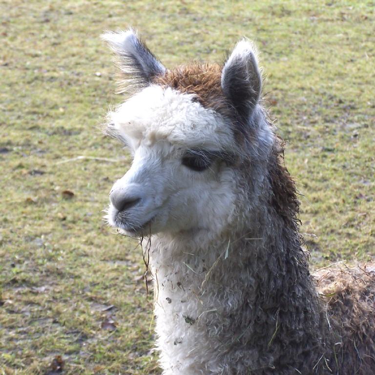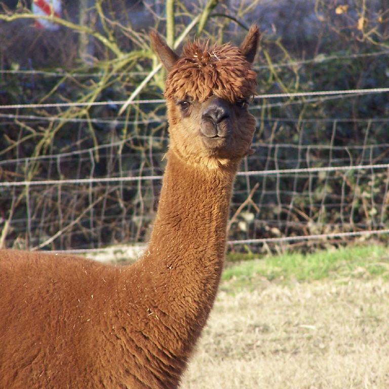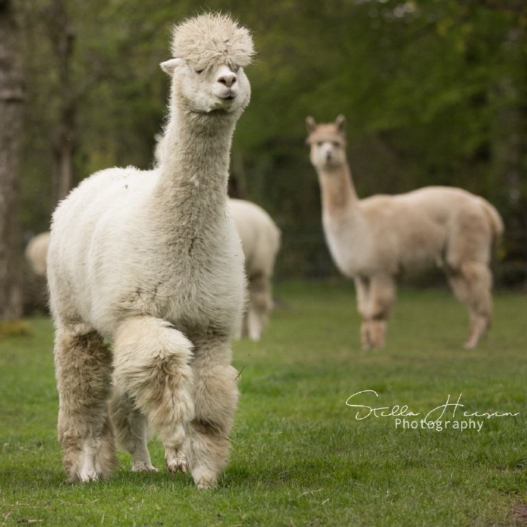 Wenn sie Lust hat, ist sie sehr zutraulich und verschmust, also ein eher untypisches Alpaka. Ansonsten frißt sie gern, hat meist ein wenig "Proviant" im Maul und bleibt bei Regen am liebsten im trockenen Unterstand. Mittlerweile hat sie im Winter eine wärmende Decke an.