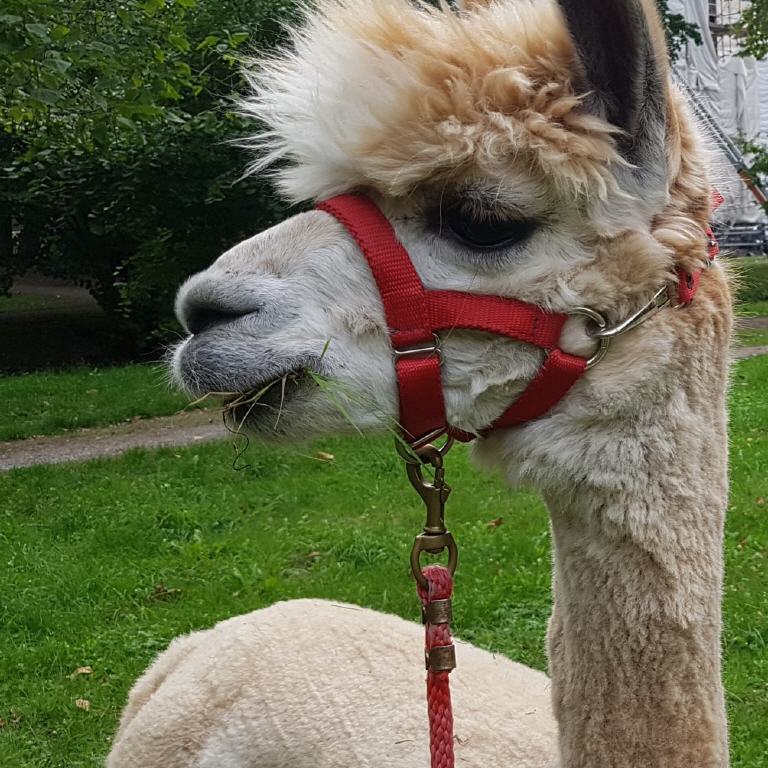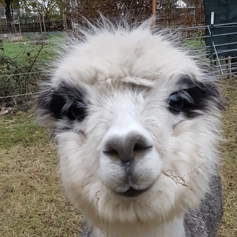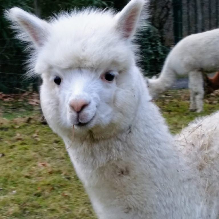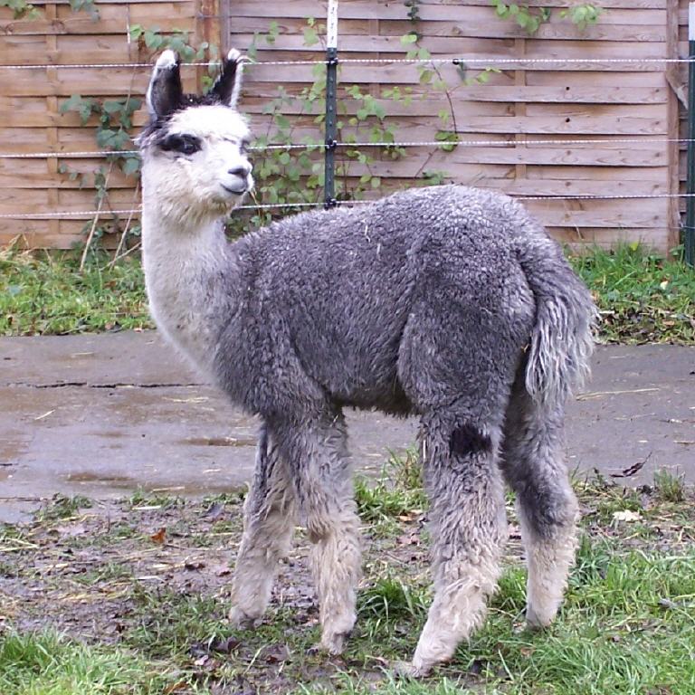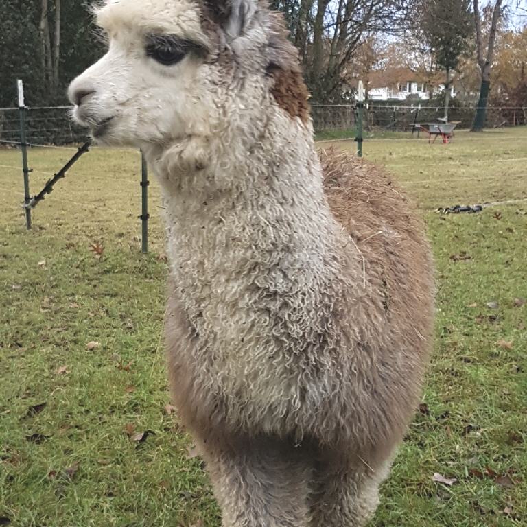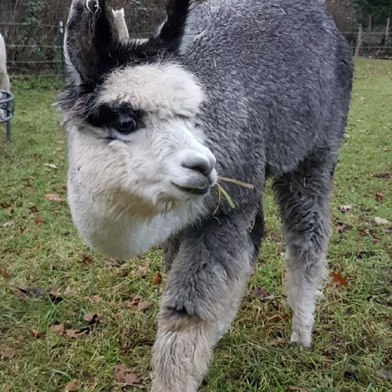 Der Wallach Rapanui, geboren im Juli 2015 bei den Auenland Alpakas, ist im September 2017 zu uns gekommen. Endlich haben wir ein graues Tier, dazu noch mit einer sehr interessanten Zeichnung, die viele Herzen verzaubert. Er geht gern mit auf die Spaziergänge. Dabei ist er interessiert, geht immer hinten an seiner Lieblingsposition.